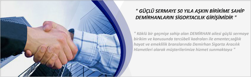 Köklü bir geçmiÅŸe sahip olan " DEMİRHAN " ailesi güçlü sermaye birikim ve konusunda tercübeli kadrosu ile elementer , saÄŸlık , hayat ve emeklilik branslarında Demirhan Sigorta Aracılık Hizmetleri olarak müÅŸterilerimize hizmet sunmaktayız.